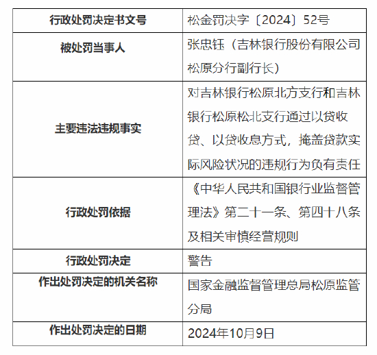 张忠钰(吉林银行股份有限公司松原分行副行长)对吉林银行松原北方支行和吉林银行松原松北支行通过以贷收贷、以贷收息方式,掩盖贷款实际风险状况的违规行为负有责任,被监管警告。