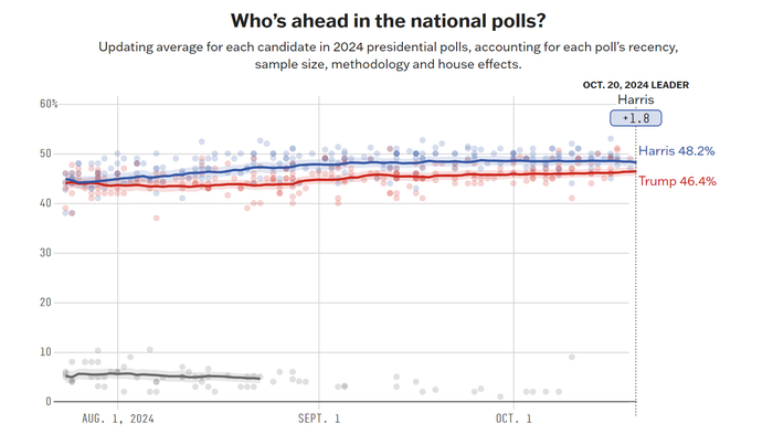 据民调数据网站fivethirtyeight显示,截至10月19日,在美国全国民调中,哈里斯的民调支持率仅略高于特朗普1.8个百分点。