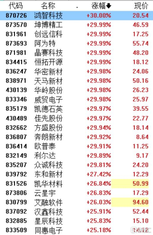 个股全线飘红,天马新材4连板,坤博精工、阿为特、晶赛科技、恒拓开源、华岭股份、威贸电子、凯德石英、方盛股份2连板,鸿智科技、创远信科、华密新材、众诚科技等30CM涨停。