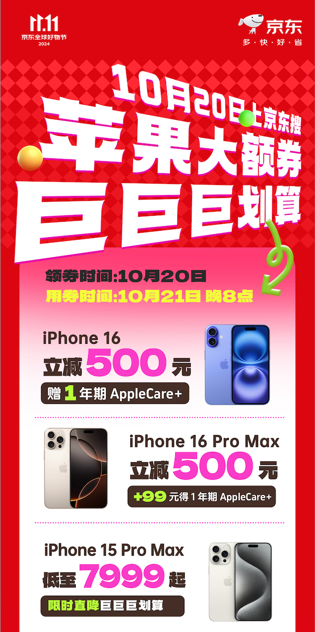 京东11.11买iPhone16系列至高优惠1600元还赠一年AppleCare+