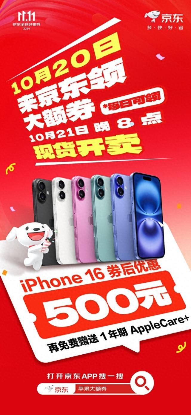 目前,京东11.11已全面开启,想要入手Apple产品的消费者也迎来iPhone 16系列最佳购买时机。为了让果粉可以放心选购,Apple产品京东自营旗舰店也官宣10月21日晚8点现货开卖,iPhone 16系列至高优惠1600元。只需打开京东APP搜索【苹果大额券】,必领500元惊喜券、1100元旧机补贴手慢无,购指定款iPhone 16还免费赠送价值649元的1年期AppleCare+。此外,iPhone 15 Pro Max、MacBook、AirPods等均有超值惊喜价,这波福利千万不要错过。