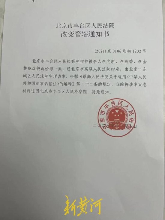 2021年7月29日,丰台分局以李文新、李燕香、李金林涉嫌虚假诉讼罪向丰台区人民检察院移送审查起诉。8月25日,丰台区检察院向丰台区法院提起诉讼。