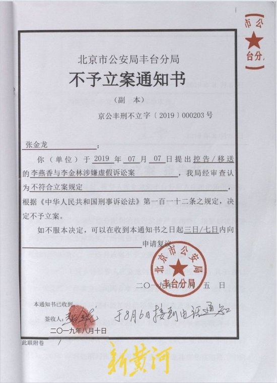 2019年8月,北京市公安局丰台分局刑侦支队调查后认为,对相关账目进行梳理,未发现账目上面有明显漏洞,就李金林与李燕香的个人账户转账来看,确实存在1亿余元的账目,没有确切证据能够证明虚假诉讼案件的发生,李燕香与李金林涉嫌虚假诉讼案不符合立案条件。