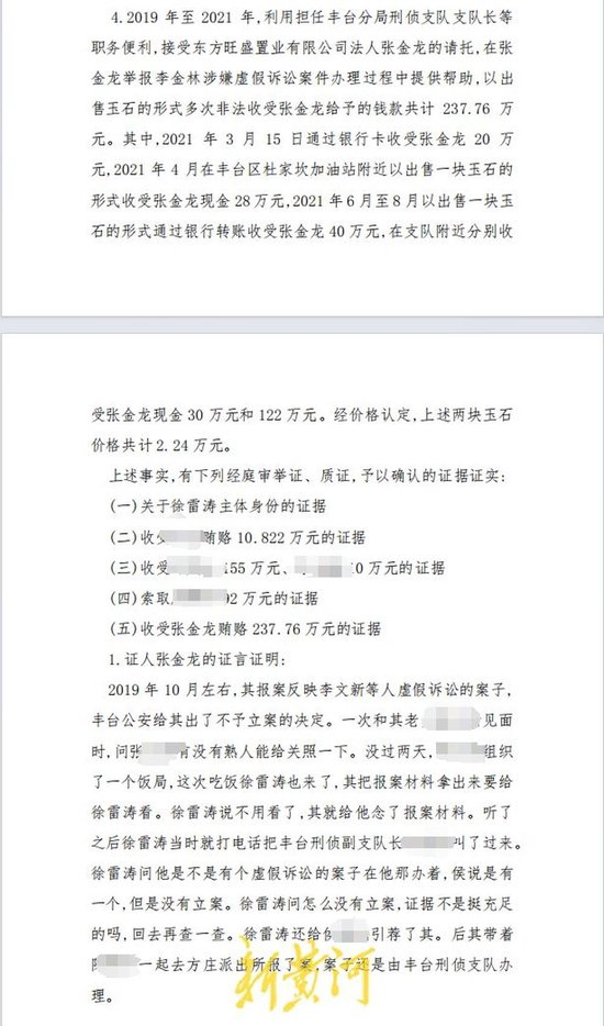 因为一起数千万元的债权纠纷,福建莆田籍在京商人张金龙以同乡李金林、李燕香涉嫌虚假诉讼为由,向北京市公安局丰台分局刑侦支队报案,警方调查后决定不予立案。直到2019年10月,张金龙结识了丰台分局刑侦支队支队长徐雷涛,在三年内多次向其行贿。其中,为了“买”他手中的一块石头,张金龙先后给了徐雷涛192万元。在徐雷涛的直接干预下,这起虚假诉讼案件得以立案,2021年李金林、李燕香及其兄长李文新先后被刑拘。