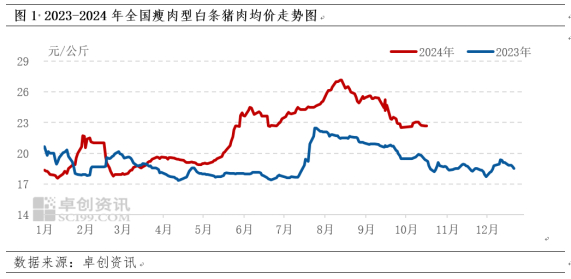 2024年全国瘦肉型白条猪肉价格呈先涨后跌的走势。根据卓创资讯监测数据,截至10月18日,全国瘦肉型白条猪肉均价为22.67元/公斤,同比上涨14.00%,较年初上涨23.54%;年内最高点为8月15日的27.17元/公斤,最低点为1月12日的17.57元/公斤,高低值价差为9.60元/公斤。10月猪肉价格主要跟随原料生猪价波动,而消费端相对疲软的现状持续掣肘白条的上涨幅度。