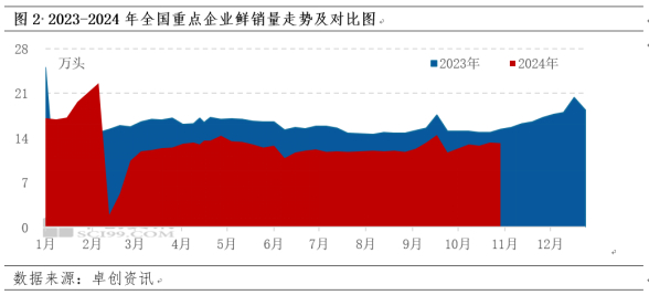 从上游考虑,养殖端压栏增重及二次育肥活动拦截屠宰猪源,企业屠宰量较去年同期出现较明显下滑。而年内屠宰端盈利情况多数时间段处于亏损状态,猪肉订单销售速度欠佳,而企业多为以销定产心态,这也导致了年内屠宰端整体的收购意向不强,鲜品供应体量整体有限。根据卓创资讯监测显示,2024年春节后猪肉鲜销同比下滑明显。截至10月18日,企业日度平均鲜销量为13.17万头,较年初下滑22.82%,同比下滑12.51%。鲜品供应体量的减少,奠定了2024年鲜品猪肉上涨的主基调。10月,上游养殖端供应压力增大,猪肉供应较为充裕,叠加天气转凉,企业收购意向小幅好转,鲜销量呈缓增态势。