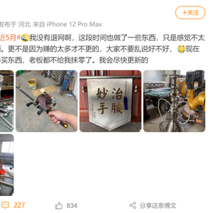 21日中午,“手工耿”发文回应“退网”传闻称:“我没有退网啊,这段时间也做了一些东西,只是感觉不太好就没有发视频。更不是因为赚得太多才不更的,大家不要乱说好不好。现在我去村里的超市买东西,老板都不给我抹零了。我会尽快更新的。”