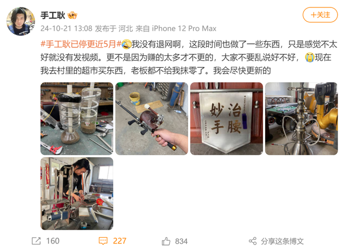 10月21日,网红@手工耿 自5月21日更新视频后,至今已有5个月未更新。其个人社交平台上的最后一条视频,是一个多功能工作台,不少网友怀疑其已经“退网”。