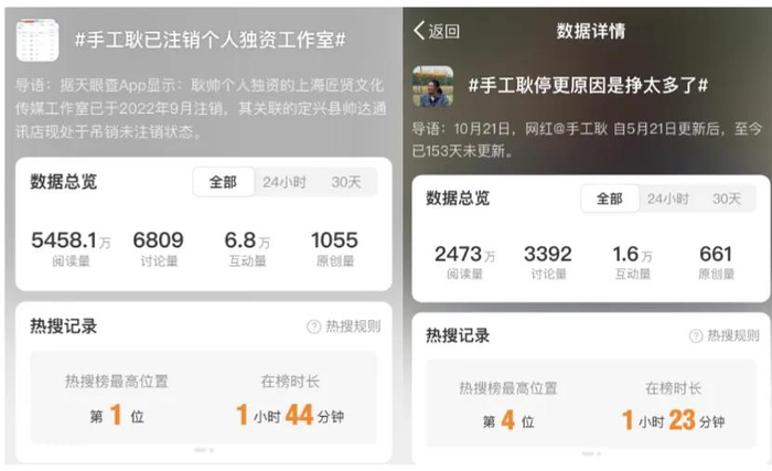 10月21日上午,词条#手工耿已注销个人独资工作室##手工耿停更原因是挣太多了#相继登上微博热搜榜。