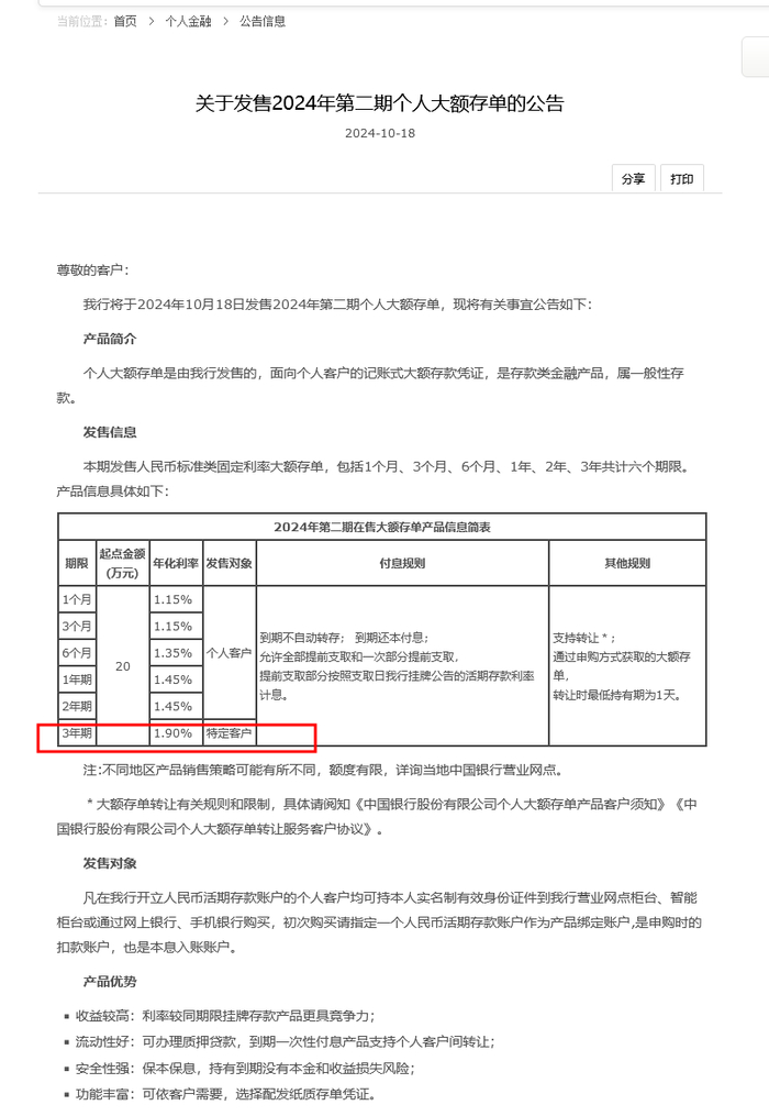 在公告中,中国银行表示,个人大额存单是由该行发售的,面向个人客户的记账式大额存款凭证,是存款类金融产品,属一般性存款。该行将于2024年10月18日发售2024年第二期个人大额存单,现将有关事宜作公告。