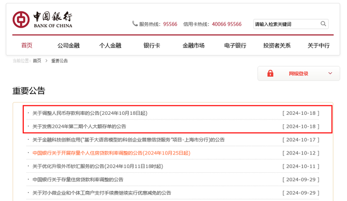 10月18日,中国银行在官网发布关于发售2024年第二期个人大额存单的公告。起购点为20万元。