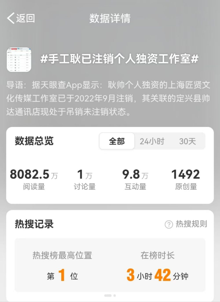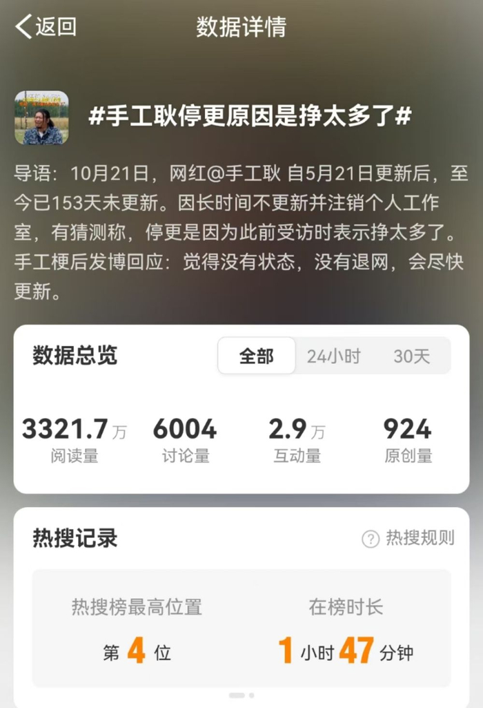 10月21日上午,词条#手工耿已注销个人独资工作室##手工耿停更原因是挣太多了#相继登上微博热搜榜。
