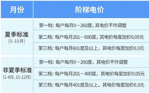 从三个档位电量可以看到,非夏季标准二档收费比夏季标准少60度,三档收费比夏季标准少200度,因此更容易跨到下一个收费档位,电价也是每跨一个阶梯档级就上升一个价位。