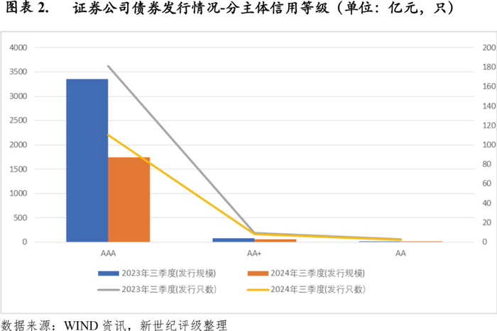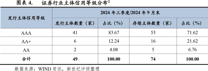 2024年三季度,证券行业发行债券主体共计49家,其中AAA级主体41家,AA+级主体6家,AA级主体2家。截至2024年9月末,证券行业仍在公开发行债券市场有存续债券的发行主体共计74家,其中AAA级主体53家,AA+级主体16家,AA级主体5家。具体情况详见附录一。