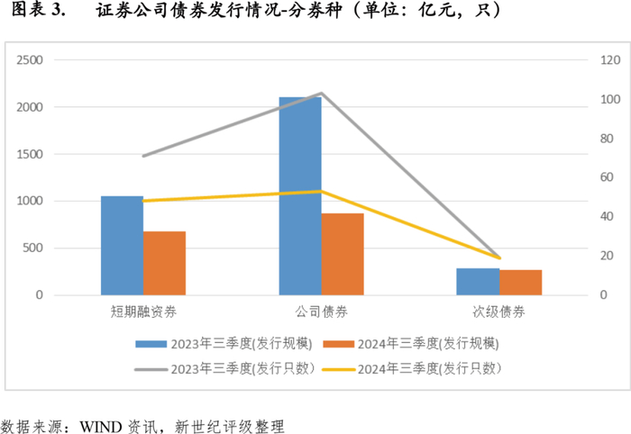 从证券公司发行券种上看,2024年三季度,发行量较大的债券种类为公司债券和短期融资券,发行规模分别为872.30亿元和680.00亿元。其中,短期融资券的发行期限主要集中在90天及以上,公司债发行期限以3年居多。同比来看,2024年三季度,证券公司债券总体发行规模较2023年同期有所回落,其中,短期融资券发行规模同比下降35.55%,公司债券发行规模同比下滑58.55%,次级债券发行规模同比下降5.16%。