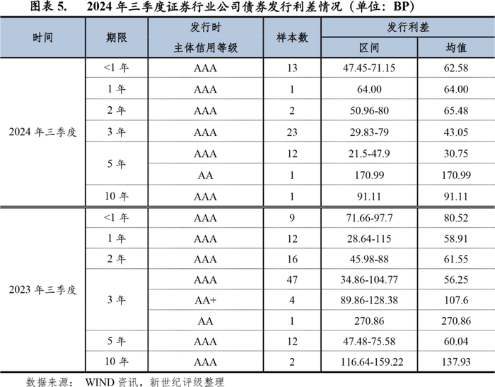 从债券发行情况看,2024年三季度,证券行业发债主体信用等级集中于AAA级,行业内主体信用质量较高。从发行利差来看,相较于公开发行产品,私募产品发行利差相对较大。