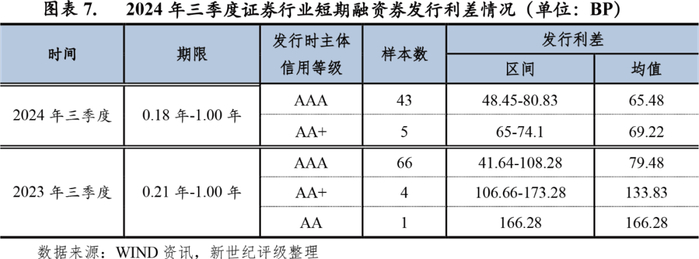 2024年三季度,证券公司发行了48支短期融资券,期限包括0.18年-1年期。其中,主体信用等级为AAA级的利差均值为65.48BP,主体信用等级为AA+级的利差均值为69.22BP。同比来看,2024年三季度新发行的短期融资券中,主体信用等级为AAA级和AA+级的样本利差均值较去年同期明显下降。