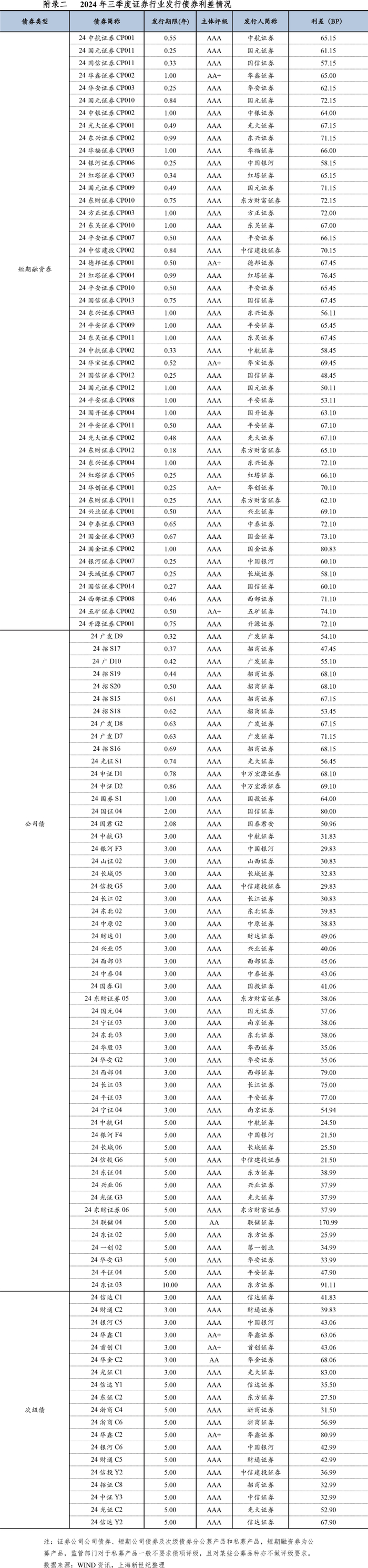 2024年三季度,证券公司合计发行53支公司债券、19支次级债券和48支短期融资券,具体发行利差情况详见附录二。