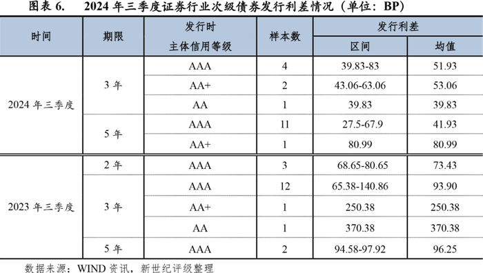 2024年三季度,证券公司共发行19支次级债券,期限包括3年期和5年期,主体信用等级多为AAA级和AA+级。同比来看,2024年三季度新发行次级债券中,主体信用等级为AAA级的3年期和5年期次级债券利差均值较去年同期均有不同程度下降。
