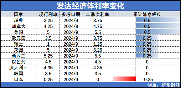 按降息幅度看,加拿大央行及瑞典央行分别于三季度内累计降息50个基点,欧洲央行、瑞士央行、英国央行以及新西兰央行则分别降息25个基点。