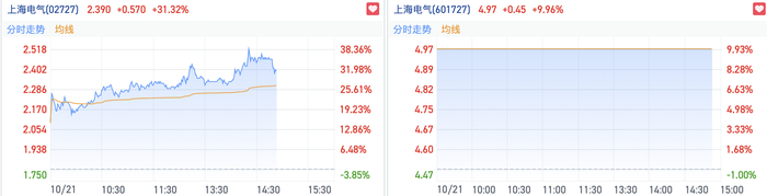 财联社10月21日讯 受并购重组热度驱动,今日上海电气(601727.SH;02727.HK)AH股双双跳涨。截至发稿,上海电气A股涨停封板,H股大涨逾30%,成交超8亿港元。