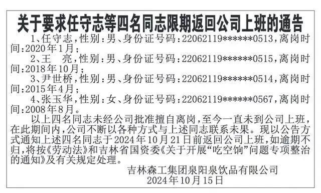 10月15日,《吉林日报》第6版刊发了一则吉林森工集团泉阳泉饮品有限公司《关于要求任某某等四名同志限期返回公司上班的通告》。