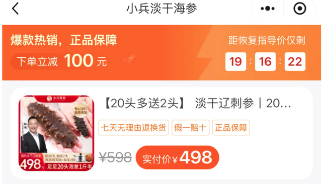 10月12日,记者在微信平台看到“小兵海参直购”的促销广告,称国标淡干辽刺参清仓福利大促,拍1发4,实付498元/份,到手22头/50克,视频广告还宣称“1个账号只能领1单”“卖完就恢复市场价”,并显示“已售10W+”。产品详情上方黑字显著标示“2小时后即将恢复原价1698(2)”,顶部还有一个闪动的倒计时表,标示“距恢复指导价仅剩19:51:61”,画面上不断闪现“用户158****7223两分钟前购买了该商品”,营造促销产品很抢手的氛围。