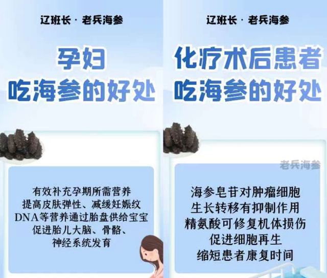 微信号“辽班长·老兵海参”宣称“孕妇吃海参的好处,有效补充孕期所需营养,提高皮肤弹性,减缓妊娠纹,DNA等营养通过胎盘供给宝宝促进胎儿大脑、骨骼、神经系统发育”;化疗术后患者吃海参的好处:“海参皂苷对肿瘤生长转移有抑制作用,精氨酸可修复机体损伤,促进细胞再生,缩短患者康复时间”等。