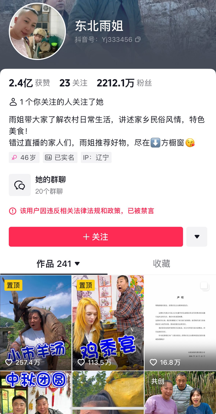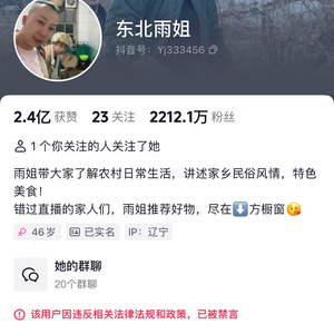 东北雨姐抖音账号被禁言