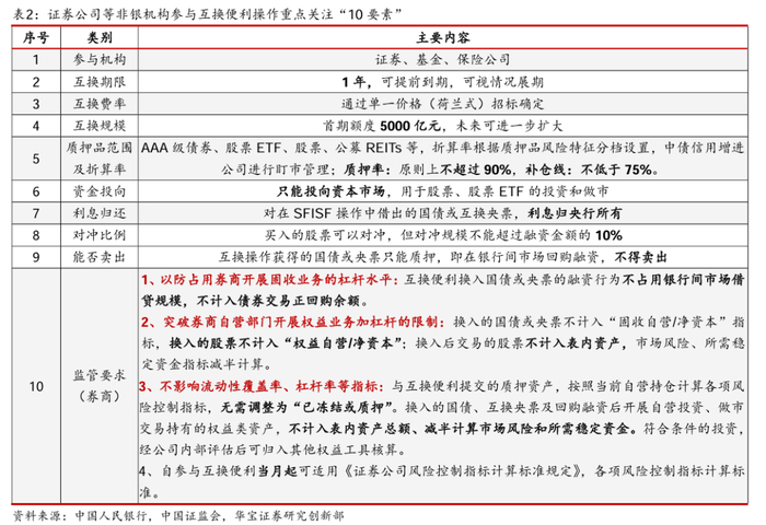 从具体操作细则来看,放宽了券商通过互换便利持有证券的经营性指标要求。如,换入的国债和央票不占用银行间市场借贷规模、不计入“非权益自营/净资本”指标、不计入表内资产、减半计算市场风险和所需稳定资金,针对性调整指标能够有效降低互换操作对券商现有业务流动性覆盖率、可加杠杆空间的影响,提升券商等非银机构卖掉持有的国债或央票,用置换出的现金开展股票、股票ETF的投资和做市交易的积极性。5000亿元额度用完后,会考虑进一步释放额度,资金持续循环,在没有基础货币投放、不“扩表”的情况下,增加资本市场的流动性。