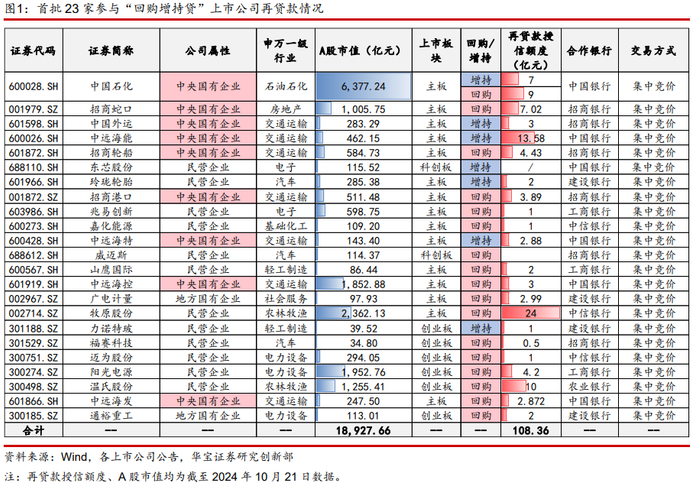 “回购增持贷”对所有制上市公司一视同仁,首批11家央国企上市公司带头,大市值行业龙头、指数权重股公司积极参与。10月20日,首批23家上市公司相继发布公告称,公司或主要股东已与银行签订贷款协议或取得银行贷款承诺函,将使用贷款资金实施股份回购或进行股东增持,回购增持贷款额度上限(东芯股份未披露再贷款授信额度)合计108.36亿元,均是通过集中竞价交易方式进行。
