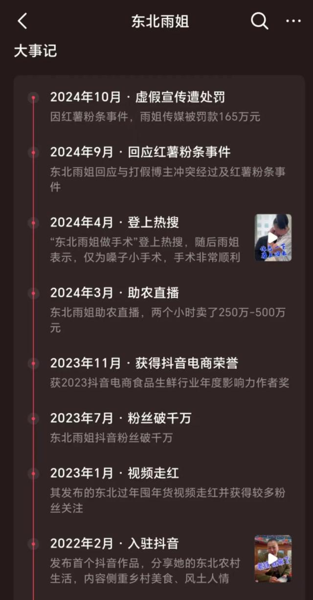 “东北雨姐”是农村生活自媒体播主,2021年才在快手发布第一个短视频,2022年2月在抖音发布短视频。2023年年初,因为一条《东北过年囤年货有多狠》迎来爆发性增长,一个月涨粉300万。