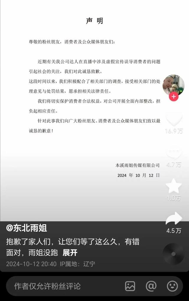 12日晚,“东北雨姐”所属公司雨姐传媒发布声明称,近期有关公司达人在直播中涉及虚假宣传误导消费者的问题引起社会的关注,对此诚恳致歉。“这段时间以来,我们积极配合了相关部门的调查,接受相关部门的处理意见与处罚结果,愿承担相关法律责任。我们将切实保护消费者合法权益,对公司开展全面内部整改,担负起相应责任。”