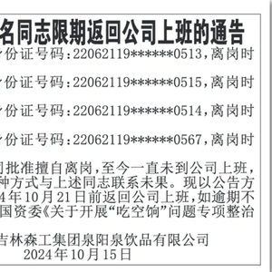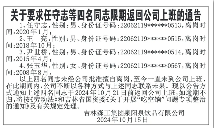 据澎湃新闻此前报道,日前,吉林森工集团泉阳泉饮品有限公司发布《关于要求任守志等四名同志限期返回公司上班的通告》,指出这4名员工擅自长期离岗。其中,一名员工的离岗时间长达16年。