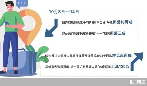 机票、酒店价格逐步回至低点,错峰游正值最佳时期。10月21日,北京商报记者搜索发现,近一段时间以来,机票价格逐步回落,部分航线票价仅百元,折扣低至1—2折;酒店方面,部分酒店单晚房价较“十一”期间大幅下调,房价降幅超过65%。当前秋意正浓,部分旅行社围绕秋季美景推出旅游产品,错峰赏秋游也在逐步升温。