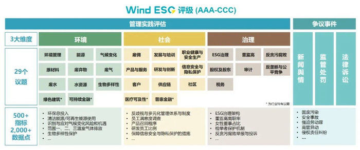 Wind ESG评级由管理实践与争议事件两大部分组成:管理实践指标体系区分环境、社会、治理三大维度,细分29个议题,并下设500多个具体指标;争议事件基于新闻舆情、法律诉讼、监管处罚进行评估,以综合反映企业的ESG管理实践水平以及重大突发风险。