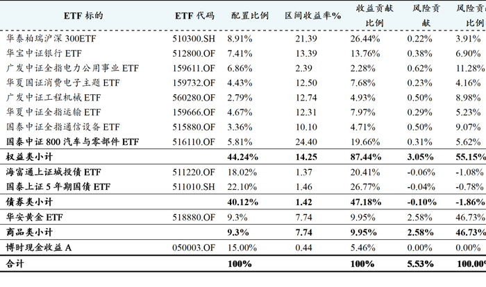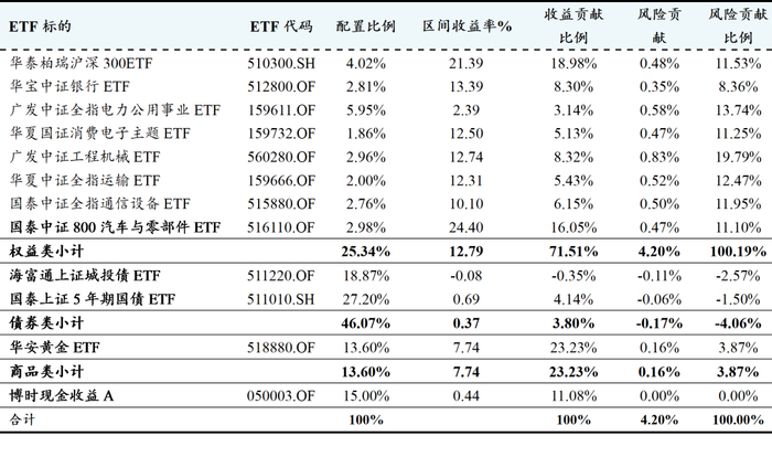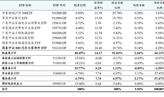 综合来看,2024年第三季度资产配置组合的收益贡献主要来自权益类资产,受益于第三季度末一系列政策对资本市场提振,A股迎来趋势普涨。收益端来看,国泰中证800汽车与零部件ETF、华泰柏瑞沪深300ETF和华宝中证银行ETF录得涨幅居前三,所有权益类ETF都实现正收益,且除广发中证全指电力公用事业ETF以外都实现10%+收益。债券类表现相对较差,国泰上证5年期国债ETF和海富通上证城投债ETF区间收益率分别为-0.08%0.69%。商品类资产仅配置黄金,在金价走高的背景下华安黄金ETF实现7.74%的收益。通过品类分散化、对权益类资产与债券类资产等不同品类配置,我们一定程度上规避了单一市场的系统性风险。风险端来看,第三季度风险贡献主要来自权益类资产。在保守型、保守稳健型、稳健型、稳健进取型和进取型组合中,权益类资产风险贡献比例分别为27.22%100.19%72.04%55.15%44.13%;债券类资产风险贡献比例分别为47.99%-4.06%-2.83%-1.86%-1.59%;商品类资产风险贡献比例分别为24.79%3.87%30.79%46.73%57.47%。现金类资产一般被视为无风险收益。权益类资产在各类组合中的风险贡献较大,整体来看是广发中证工程机械ETF和广发中证全指电力公用事业ETF的风险贡献比例相对较大;而华泰柏瑞沪深300ETF、华夏国证消费电子主题ETF和国泰中证800汽车与零部件ETF的风险贡献比例相对较小。