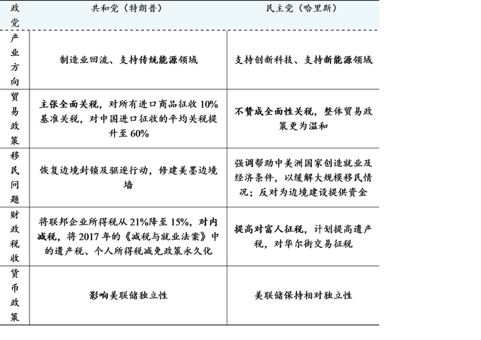 若特朗普胜选,其主张推动企业减税,长期看或提高企业盈利能力,利好美股市场表现;同时,其支持传统基建及提高传统能源供应、推动制造业回流,中长期预计将对我国出口链形成一定压力,但在其正式上任前的窗口期则形成支撑;推升美国中长期通胀中枢。若哈里斯胜选,则扩大财政支出压制美元表现;此外扩大新基建、支持信息科技以及新能源领域,或将利好相关板块的表现;对金融领域监管更为强硬,若其顺利当选,短期内美国金融股可能面临下行风险。