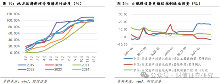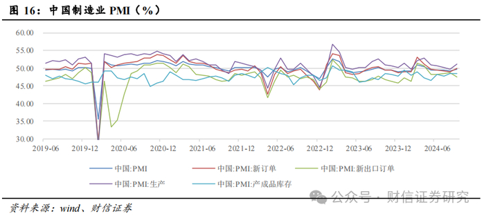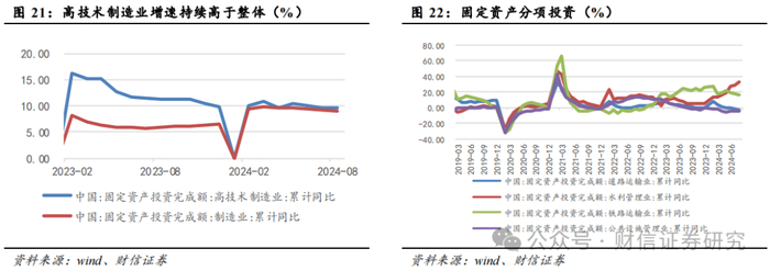 制造业增速高位放缓,高技术制造业投资持续引领。2024年的前8个月,制造业的投资增长了9.1%,虽然仍然是三大投资领域中最高的,但其比去年同期下降了0.2个百分点,并且已经连续五个月放缓。制造业投资的放缓有三大原因:一是大规模的设备更新继续支持着制造业的投资,但支持作用正在减弱,1-8月份设备和工具的投资增长了16.8%,较前值下降0.2个百分点;二是由于PPI的降幅扩大以及国内外需求的放缓,制造业企业扩张意愿有所减弱;三是产能利用率的持续低迷限制了企业资本扩张的动力。从行业来看,上游、中游和下游行业的投资增速都在放缓,其中中下游行业的放缓幅度更大。上游方面,由于PPI降幅扩大和房地产、基础设施需求的放缓,有色金属、化学原料等上游原材料行业的增速有所回落,但重点行业的能耗、排放和技术标准的提升继续支持着投资增速韧性;中游方面,1-8月装备制造业投资增长10.0%,较1-7月份回落0.7个百分点,总的看中游装备制造业的投资增速出现了分化,汽车、通用设备、计算机通信等行业的投资增速加快,但电气机械、铁路船舶航空、金属制品等行业由于之前的基数较高,增速有所回落;下游方面,由于国内消费需求恢复的放缓和物价低迷影响了企业盈利预期,下游消费品制造业的投资增速大多放缓,整体上1-8月份的增速比1-7月份下降了0.9个百分点。大规模设备更新和消费品以旧换新政策效应释放,高技术制造业和装备制造业维持高景气。1-8月份,高技术制造业的投资增长了9.6%,较制造业投资的整体增速高出0.5个百分点,国内产业升级的步伐继续推进。展望未来,预计制造业的投资增速高位震荡,高技术制造业大概率是后续财政政策发力重点方向之一,支撑制造业增速维持在8.5%左右。具体来看,已经逐步落地的大规模设备更新政策的进一步实施将对上游原材料和中游装备制造业的投资形成较强支撑,而后期财政增量政策可能对高技术制造业形成新的支持。例如,9月份高技术制造业和装备制造业PMI分别为53.0%52.0%,比上月提高1.30.8个百分点,边际改善幅度较大。不过,全球需求放缓和国内PPI持续负增长,可能会抑制制造业投资意愿。另外,9月份制造业PMI49.8%,景气度连续5个月处于收缩区间,制造业持续保持高增速的基础尚不牢固。其中,9月份生产指数较上月上升1.4个百分点至51.2%,新订单指数较上月上升1.0个百分点至49.9%,导致制造业生产和新订单指数差由上月的0.9%升至本月的1.3%,供需缺口有所扩大,制造业供强需弱格局延续也会一定程度抑制制造业投资增速。