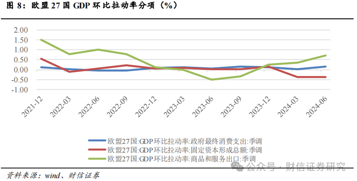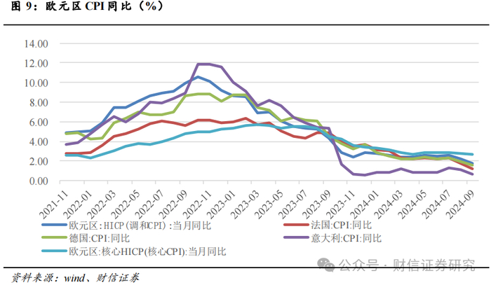 从通胀水平来看,虽然整体通胀率有所回落,欧元区HICP同比增速较2022年最高点已经回落8.8个百分点,较20239月最后一次加息时也有明显回落,但核心通胀压力依然存在。具体来看,9月份欧元区CPI同比增长1.8%,较8月的2.2%有所下降,但核心调和CPI同比增长2.7%,仅较前值下降0.1个百分点,降幅小于CPI,表明潜在的价格压力依然存在。此外,服务业通胀比预期更持久,且服务通胀的持续性在欧元区国家中普遍存在,表明核心通胀的进一步下降需要依赖服务业通胀的放缓,而目前服务业通胀下降进展似乎已经停滞,通胀前景仍存在不确定性。