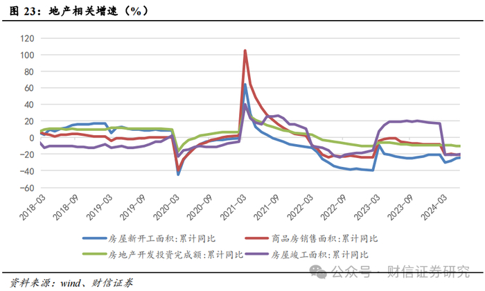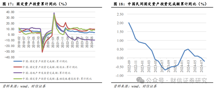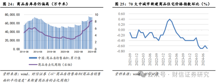基建投资方面,极端天气叠加项目缺乏导致增速有所下滑。20248个月里,基础设施建设的投资增长了7.9%,如果不考虑电力行业,则增长了4.4%,由于极端天气条件,如高温和强降雨,以及缺乏高质量的本地项目的影响,这两个指标都比1-7月有所下降。具体到各个行业,1-8月份电力热力燃气及水的生产和供应业、交通运输仓储和邮政业、水利环境和公共设施管理业分别增长23.5%6.7%1.2%,较前值分别回落0.41.5个百分点和提高0.5个百分点,交通运输业的投资增长放缓最为显著,而电力行业的投资增长则继续高位下降。展望未来,虽然政府债券加快使用可能会对基建投资增长形成有力支持,但是资金的分流或削弱这种力度。具体来说,9月份新增的专项债券发行量约为10279亿元,比前8个月有明显增加。按照目前的速度,9月底发行进度已经超九成,预计剩余专项债券将在10月底前发行完毕,这将为基础设施建设投资提供强有力的资金保障。然而,由于超过30%的新发行专项债券的用途尚未明确,预计在本地优质项目不足和地方政府债务压力较大的情况下,这些债券的投向可能会进一步分散,因此对基础设施建设投资的支持作用不应被过分乐观。此外,截至7月底,金融机构的财政存款余额仍高于近年来的同期水平,这表明未来财政存款的加快使用可能会为基础设施建设投资提供一定的保障。然而,超长期特别国债对基础设施建设领域的支持作用可能会低于预期。一方面,今年的超长期特别国债主要集中在5月至11月发行,而且中央政府已经明确安排了大约3000亿元的超长期特别国债,用于支持大规模的设备更新和消费品的以旧换新,预计这些资金中用于基础设施建设的比例不会太高。另一方面,考虑到这些资金更倾向于支持那些具有长远利益的紧急和成熟项目,预计这些项目将更多地集中在民生和高质量发展领域。总的来说,尽管后续财政政策可能力度加码,会为基础设施建设投资提供一定的支持,但资金的分散使用和对其他领域的政策倾斜或使实际效果有所折扣,预计基础设施建设投资将保持稳定,全年的增长率可能在6.5%左右。