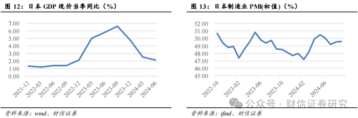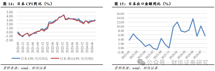在通胀方面,新首相石破茂在就任后的就职演说中强调,他的首要经济任务是战胜通缩,使国家进入稳定的增长轨道。目前,日本CPI20224月起连续二十多个月超过2%,而剔除食品和能源的核心CPI也自20224月起连续超过2%的目标值,这反映出日本的通胀水平已经稳定在其央行的目标区间内。整体来看,预计2024 CPI同比涨幅为2.8%-3.0%