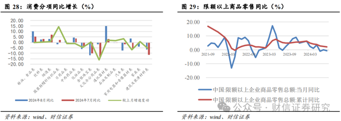 消费修复动能有所走弱,一揽子政策或促进四季度消费转暖。20241-8月份社会消费品零售总额同比增长3.4%,较1-7月份回落0.1个百分点,与去年全年两年平均增速持平。8月当月社零同比增长2.1%,较上月回落0.6个百分点;环比基本持平,但从小数点后两位看仍下降0.01%2024年以来社零已出现5个月环比为负,反映出消费增长动能持续疲弱,是拖累经济增速放缓的主要原因。限额以上商品零售增速再度转负,汽车、升级类和基本品消费多数放缓。8月份限额以上商品零售下降0.7%,增速较上月回落0.7个百分点,再次转负。主要是居民收入增长乏力、消费意愿不足所致。具体来看,受量价齐跌、居民消费意愿不足等的影响,汽车类零售额同比下降7.3%,拉动全部社零下跌0.7个百分点以上,拖累作用明显,也是限额以上商品零售转负的重要原因之一;除家电类、通讯器材类商品零售、粮油食品类基础消费等几个大类外,其他消费品类均偏弱,无论是升级类、其他基本品类和房地产相关类消费品均较2019年疫情前水平大幅回落,表明居民消费行为已明显更为谨慎。