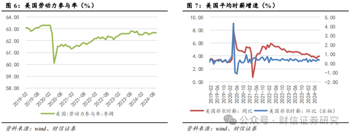 失业率方面,9月维持改善趋势。8月份失业率小幅下降至4.2%,尽管有所改善且符合市场预期,但仍然高于6月份的水平,在当时仍反映出就业市场的压力仍然存在。然而,9月份失业率4.1%,低于预期的4.2%9月劳动力参与率稳定在62.7%,预期为62.7%8月也是62.7%,连续第三个月保持在62.7%。另外,用于计算失业率的家庭就业调查显示出更为强劲的就业增长前景,这部分就业人数增加了43万人,就业/人口比率上升至60.2%,上升了0.2个百分点。