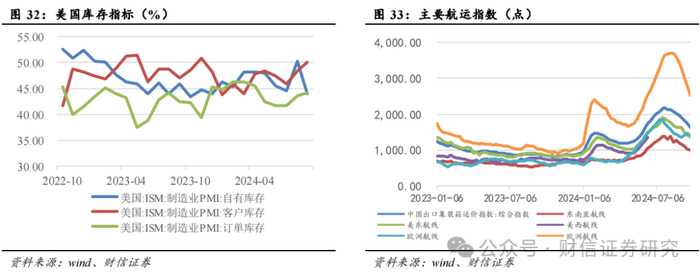 展望后市,受去年同期基数走高叠加海外经济、政治等局势不明朗等影响,四季度出口或将持续承压。一是低基数效应边际减弱。20237月出口同比增速阶段性见底为-14.3%8月出口当月同比增速已经开始探底回升至-8.55%9月升至-6.85%,而去年四季度也是快速走高,对今年四季度读数形成制约。二是全球经济景气度不明朗导致外需仍有不确定性。9月摩根大通全球制造业PMI指数为48.8%,已连续三个月处于收缩区间,反映外需放缓信号已经出现;同时,9月官方制造业PMI 指数中的新出口订单指数为47.5%,较8月大幅下降1.2 个百分点,已连续5个月处于荣枯线下方,外需存在一定不确定性;另外,从高频数据来看,全球各主要航线指数基本都有不小降幅,预示着全球贸易活跃度趋缓。三是美国大选焦灼且关税风险仍存。当下,从两位总统候选人来看,特朗普表示对中国进口产品征收高达60%100%的关税,哈里斯或继续延续拜登政府时期的对华态度,为拉拢选民和减少对华供应链依赖,有一定概率再度加征关税。美国政府913日确定大幅度上调中国产品的进口关税,以加强对美国国内战略产业的保护,一些关税将于927日生效。除了对中国电动汽车加征100%的关税以外,美国还将对中国太阳能电池加征50%的关税,对中国钢铁、铝、电动汽车电池和关键矿物加征25%的关税。同时,美国将中国半导体的进口关税提高50%,此新税率将于20251月开始生效。