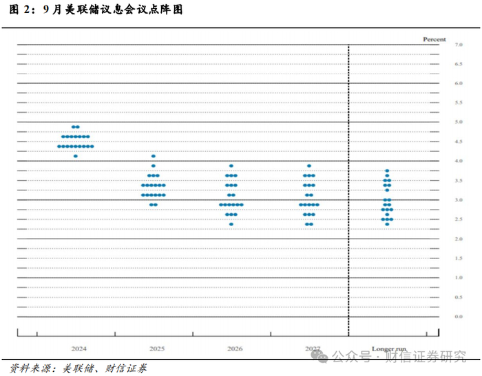 三是美联储预计在2024年将再进行两次降息,而在2025年和2026年也将继续降息。点阵图预计,与6月份的预测相比,年内降息次数增加了两次。9月份的点阵图显示,2024年末联邦基金利率适当水平的预测中值为4.4%,较6月份的预测降低了0.7个百分点,这表明美联储官员预计年内将再次降息50个基点,预计11月和12月将分别降息25个基点。此外,点阵图还显示,2025年至2026年联邦基金利率适当水平的预测中值分别为3.4%2.9%,预示着2025年将再降息100个基点,2026年将降息50个基点。同时,长期政策利率有所上调,9月份的点阵图显示长期利率预测为2.9%,较6月份上调了0.1个百分点,鲍威尔在会议中也表示,中性利率将比疫情前高得多,不会再回到低中性利率水平。