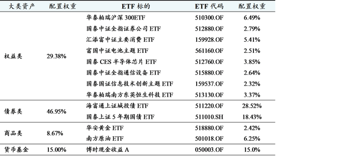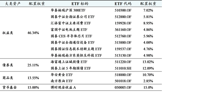 在配置标的上,现金资产为货币基金,其余以ETF为主。根据宏观分析和行业基金选择逻辑,综合考虑基金规模和日均成交额等流动性因素,权益类资产中,我们选择华泰柏瑞沪深300ETF、国泰中证全指证券公司ETF、汇添富中证主要消费ETF、富国中证电池主题ETF、国泰CES半导体芯片ETF、国泰中证全指通信设备ETF、广发国证信息技术创新主题ETF和华泰柏瑞南方东英恒生科技ETF。债券类资产上,我们选择国泰上证5年期国债ETF和海富通上证城投债ETF。商品投资上,选择华安黄金ETF和南方原油ETF。货币基金选择博时现金收益A。同时,因为12个标的基金的两两相关系数均未超过0.9,因此不作处理,具体如表中所示: