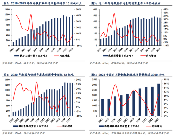 冶金矿产类大宗商品:1)铁矿石:国内铁矿石资源品位相对较低、开采难度大,供给不足,因而对外依存度较高,主要依赖于澳大利亚和巴西等国的进口,2016~2023年国内铁矿石年进口量都保持在10亿吨以上。2)焦炭:国内焦炭需求旺盛,自身为最大的焦炭生产国,同时需要一部分进口以满足国内需求;近十年国内焦炭平均表观消费量在4.5亿吨左右。3)钢材:中国是全球最大的钢材生产国,但原料铁矿石的对外依存度较高,相对受限;国内钢材的表观消费量也非常大,2020年起年度表观消费量均超过12亿吨。4)不锈钢粗钢:中国是世界上主要的不锈钢生产国,产业规模大,但原材料镍和铬高度依赖于进口,因而不锈钢产业面对国际市场价格波动时,资源保障能力相对较弱。国内不锈钢粗钢的表观消费量也呈现稳步上升趋势,2023年表观消费量超过3000万吨。