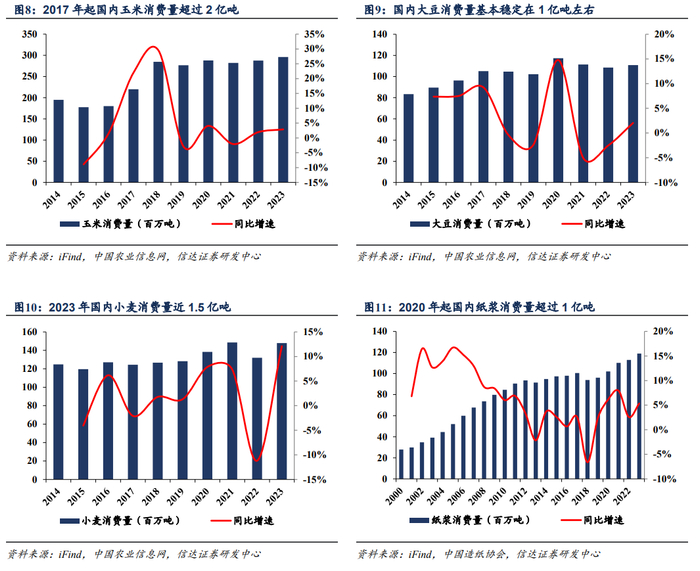 农产品&轻工制品大宗商品:1)玉米:国内玉米的产量及需求量规模都很大,可用于饲料制造、工业需求及直接消费等,用途广泛。2017年起国内玉米消费量超过2亿吨,2023年消费量近3亿吨,消费量稳步增加。2)大豆:中国是全球最大的大豆消费国,产量难以满足自身需求,需要大量进口弥补缺口,主要进口国包括巴西、美国等国家。近几年国内大豆消费量基本保持在1亿吨左右。3)小麦:中国是全球主要的小麦生产国,国内需求大,2023年消费量近1.5亿吨。4)纸浆:中国是纸浆消费大国,产量高需求量大,因而对外依存度也比较高,纸浆消费量基本保持稳定增长。2020年起国内纸浆消费量稳定保持在1亿吨以上。