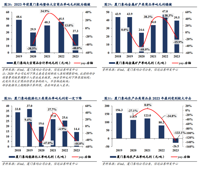 厦门象屿整体大宗商品单吨毛利较为稳健。具体品类看,毛利占比60%以上(2023年毛利占比80%以上)的金属矿产类商品单吨毛利较稳健。基本能保持在40元/吨左右。能源化工类商品毛利占比近20%,受到市场供需变化影响,单吨毛利近几年有一定下降。农产品类商品在2023年受到极端天气、国际价格市场波动、地缘政治冲突等诸多因素扰动,盈利受到较大冲击。